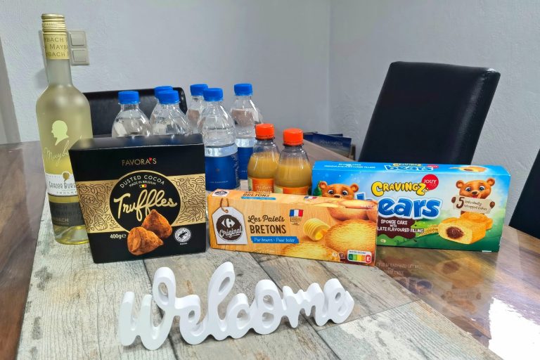 * Begrüßungsgetränke und Süßigkeiten